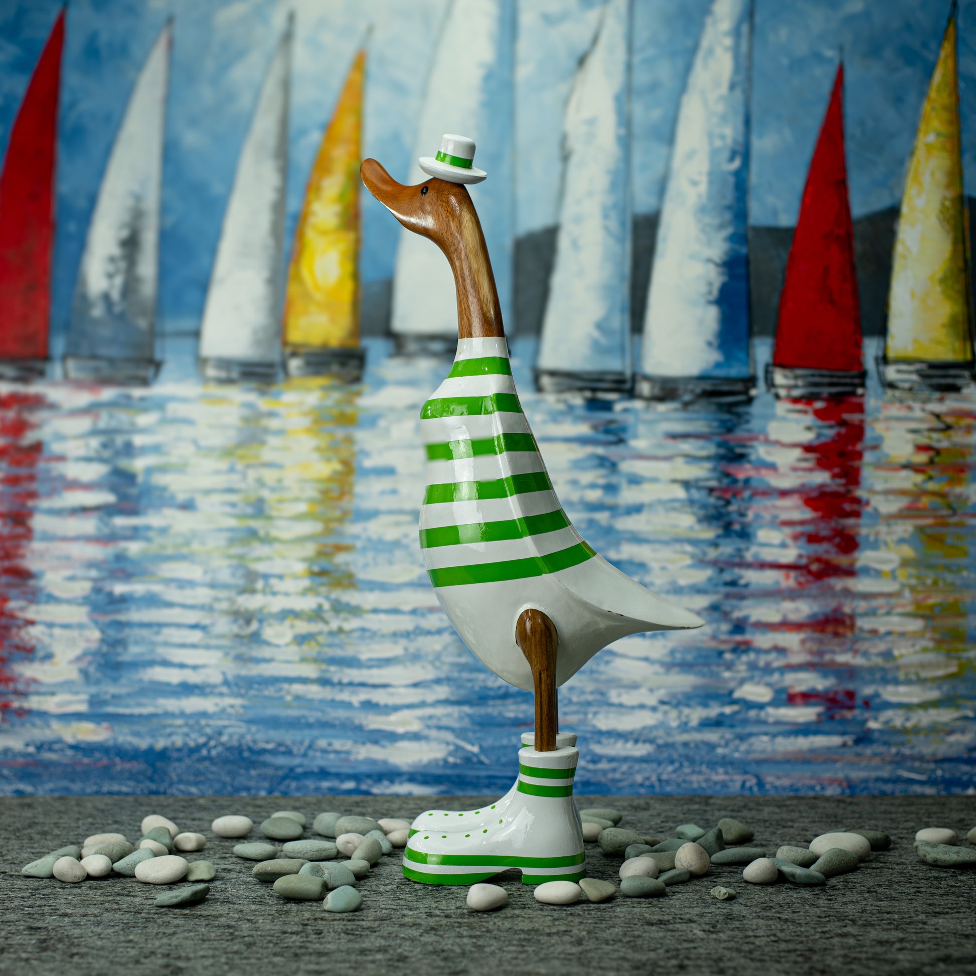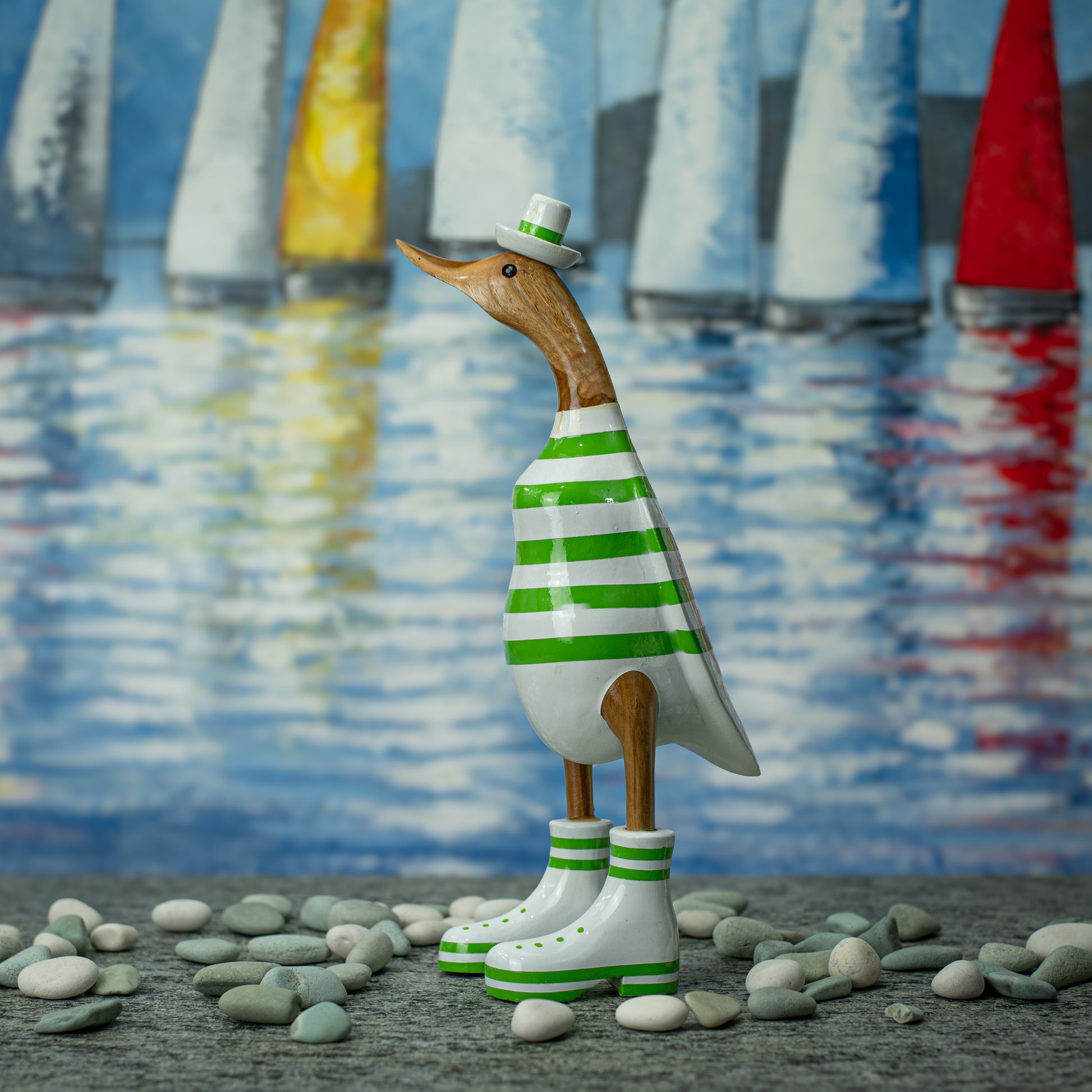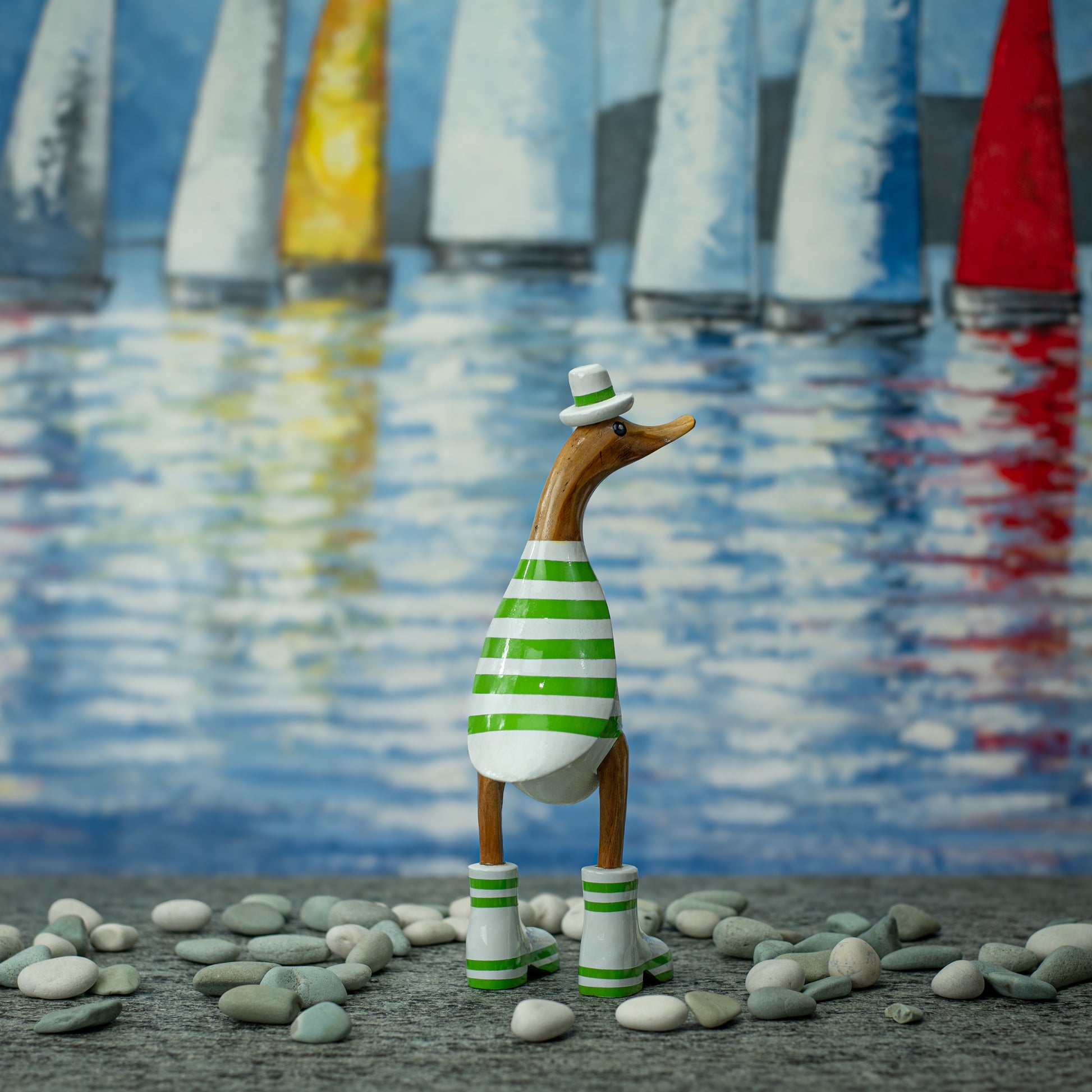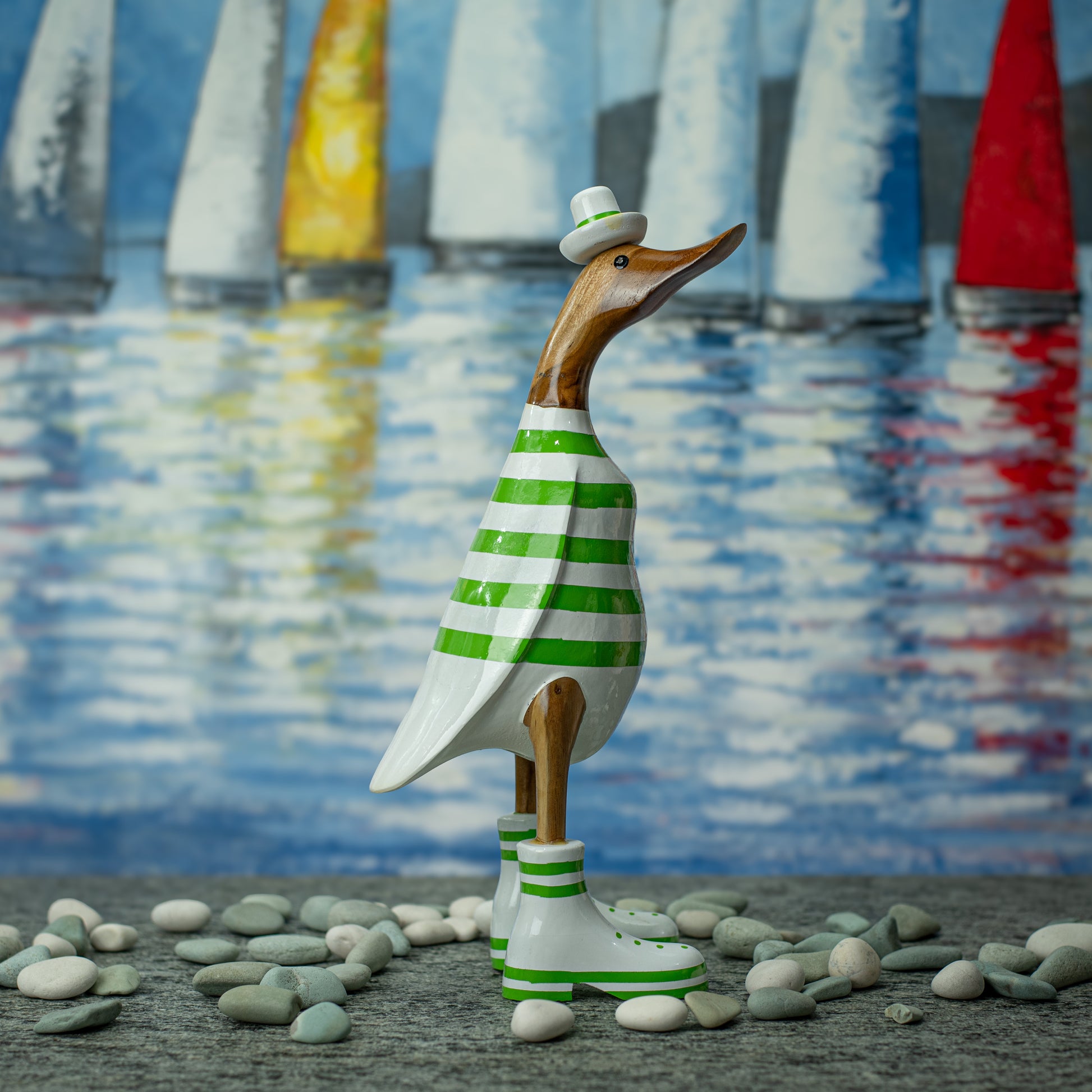 Hand Made Hand Painted Wooden Sculpture of a Duck in a Green Striped Shirt & Hat